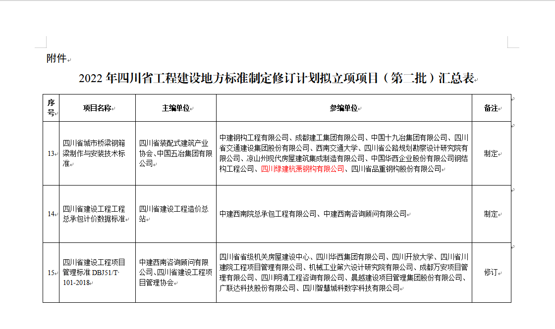“行業(yè)標(biāo)準(zhǔn)為旗桿,科研技術(shù)為導(dǎo)向”,2022年8月22日,四川綠建杭蕭鋼構(gòu)有限公司(以下簡(jiǎn)稱(chēng):綠建杭蕭)參編的《四川省城市橋梁鋼箱梁制作與安裝技術(shù)標(biāo)準(zhǔn)》在四川省住建廳官網(wǎng)進(jìn)行公示。這是繼“中國(guó)鋼結(jié)構(gòu)協(xié)會(huì)”會(huì)員單位、第二批天府綜改企業(yè)之后,同年再次獲得的殊榮。綠建杭蕭在行業(yè)領(lǐng)域標(biāo)準(zhǔn)中發(fā)出了自己的聲音!